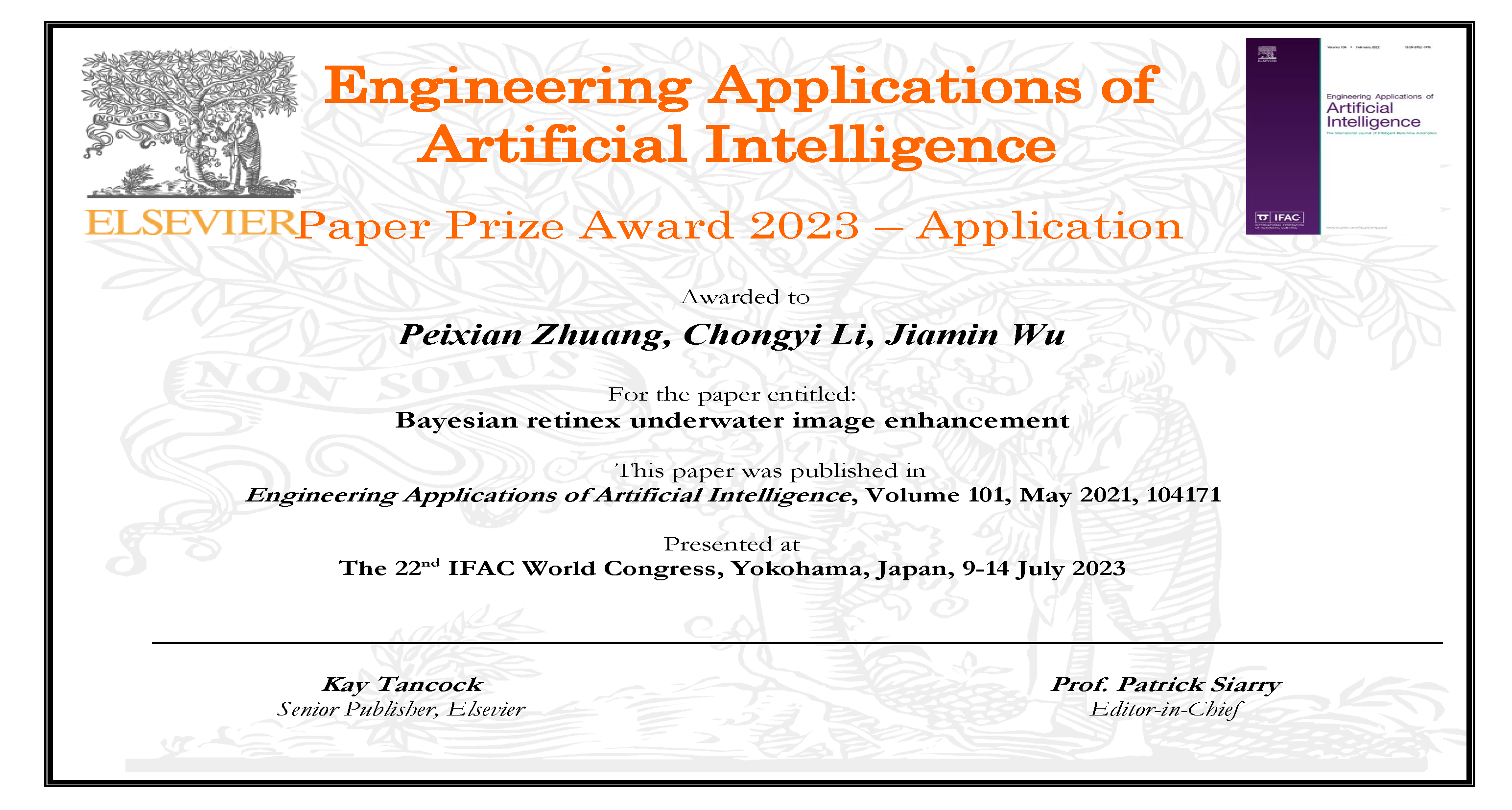 Our paper 'Bayesian Retinex Underwater Image Enhancement' has been recognized as Paper Prize Award 2023-Application by Engineering Applications of Artificial Intelligence.