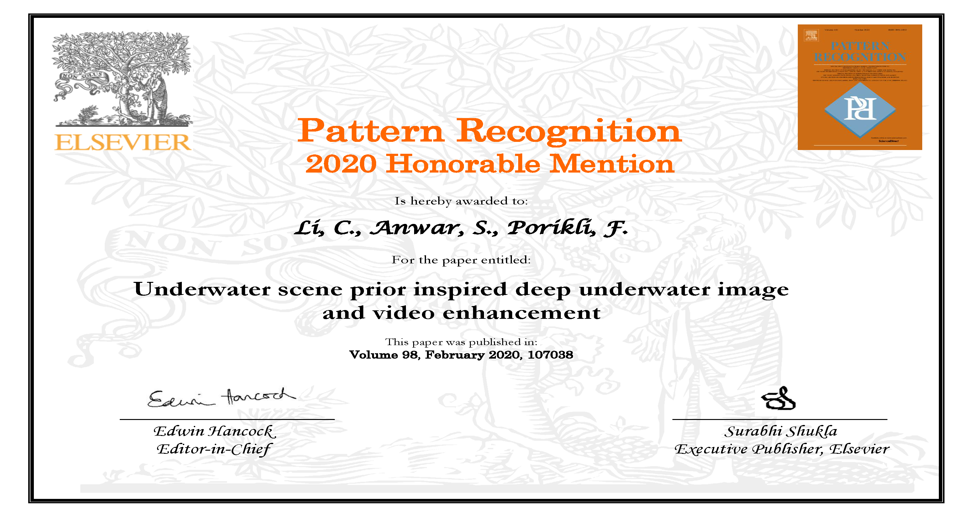 Our paper 'Underwater Scene Prior Inspired Deep Underwater Image and Video Enhancement' has been recognized as Best Paper Honourable Mention by Pattern Recognition.
